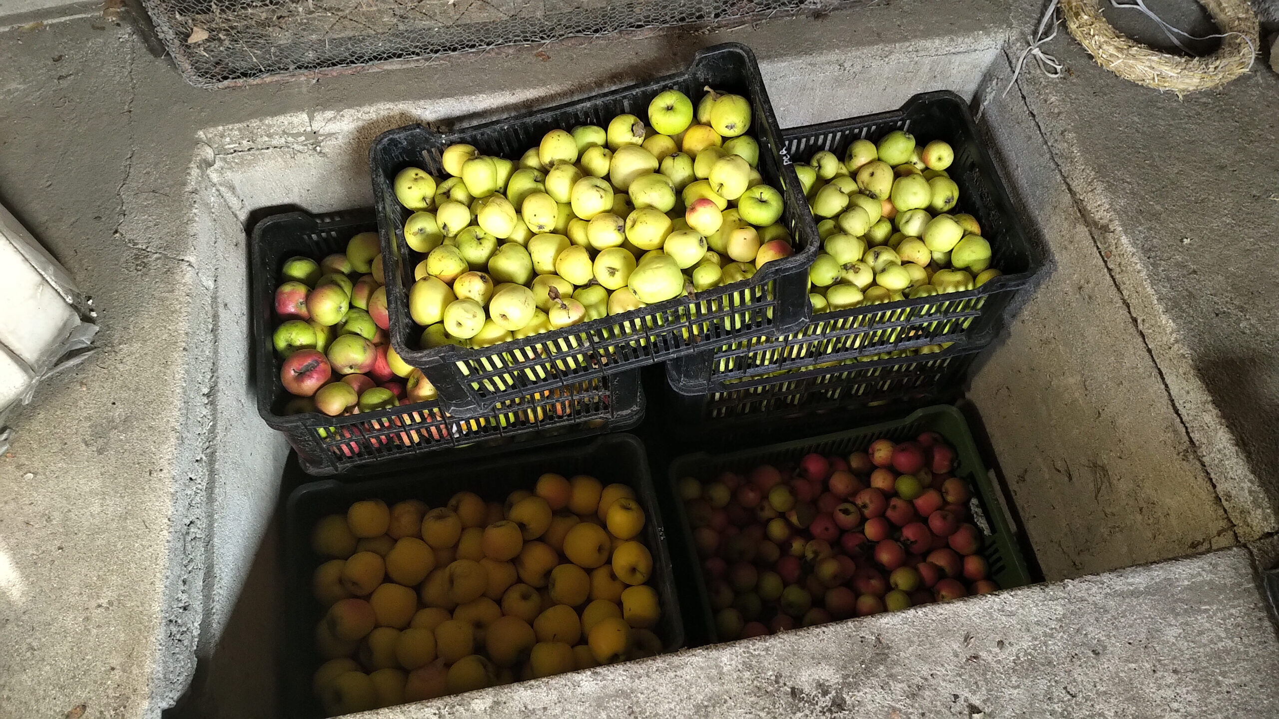 Jenže, kde vzít sklep? To je přece ranec. Je a není. Pokus si představujete sklep jako třeba domicil moravského vinaře, pak si připravte skutečně naditou prkenici. Existují ovšem i varianty docela banálně milé a proveditelné. Jak známo, je nutno mít sklepů více, protože některé sklizně není radno míchat. Díky tomu máme u nás doma v kůlně již přes padesát let sklep na jablka, kterému by se leckdo asi vysmál. Věřte nebo ne, ale v betonové podlaze obyčejné prkenné kůlny je prostá díra na dvanáct beden jablek, která nám do jara bohatě stačí. Nahoře Šampion a Golden Delicious, dole Strýmka a Zvonkové se Studničním. Jak se co sežene. Letos je to poněkud pestřejší, protože úroda leckde zmrzla (psáno 2024), tak se poshánělo všechno možné.